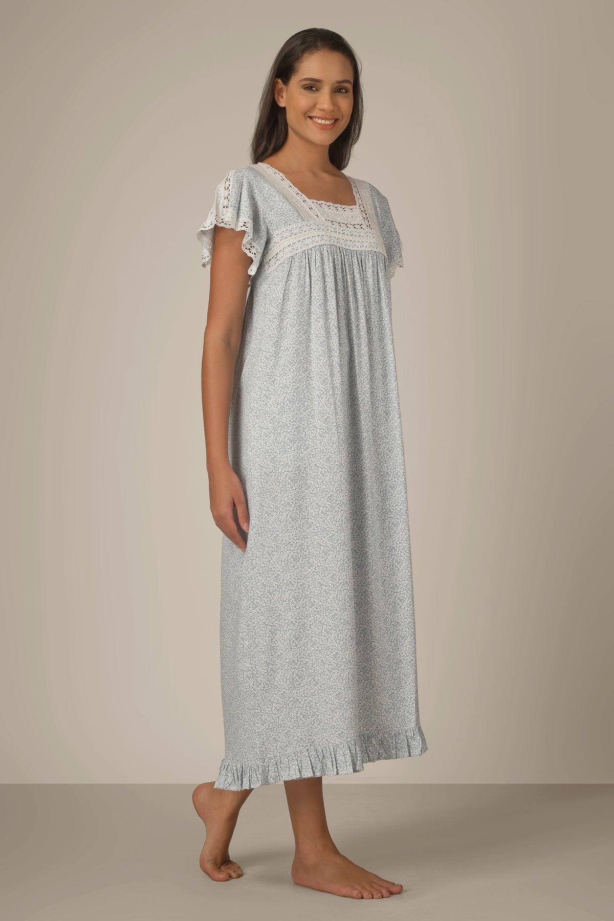 • The dress has ruffle sleeves with gather