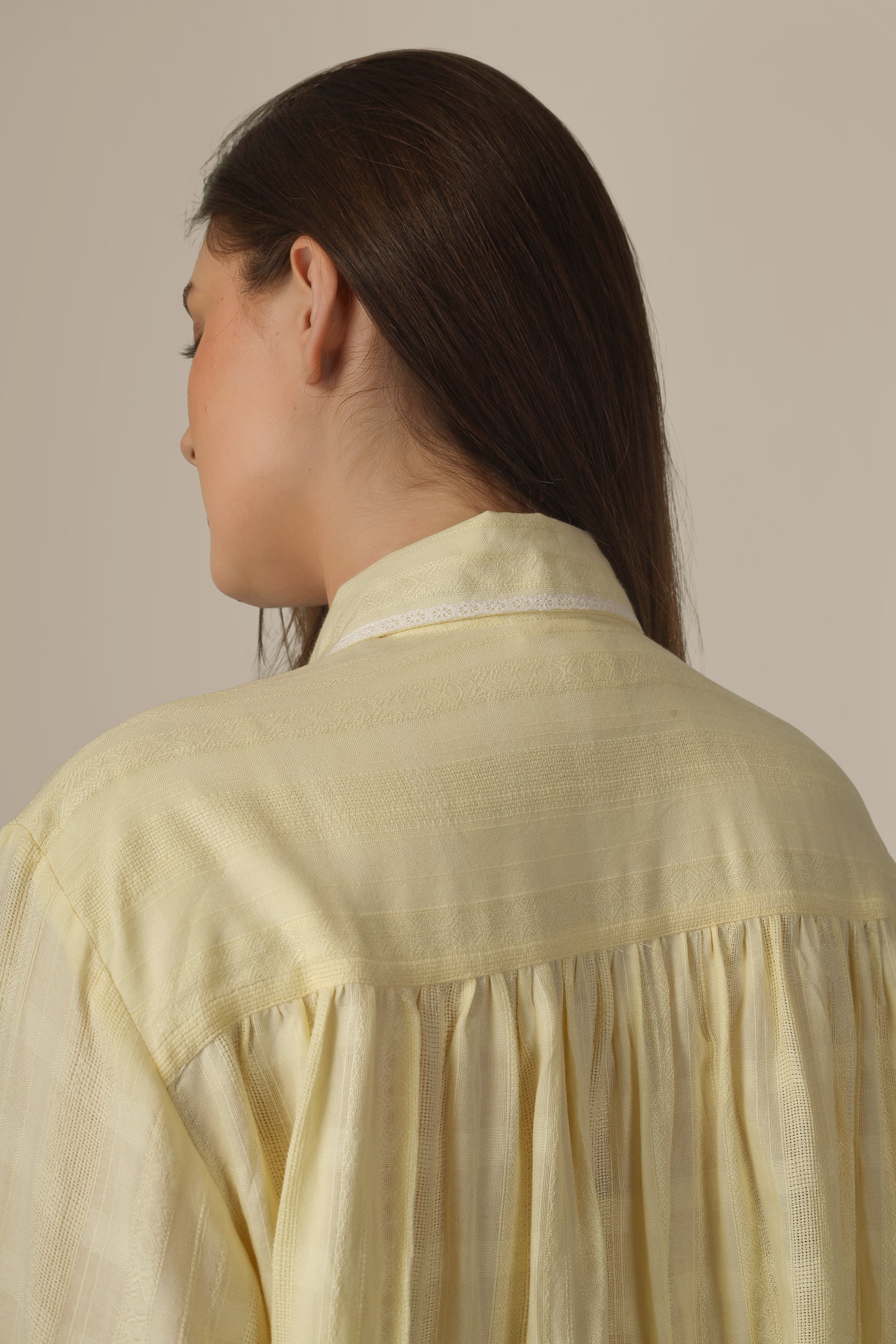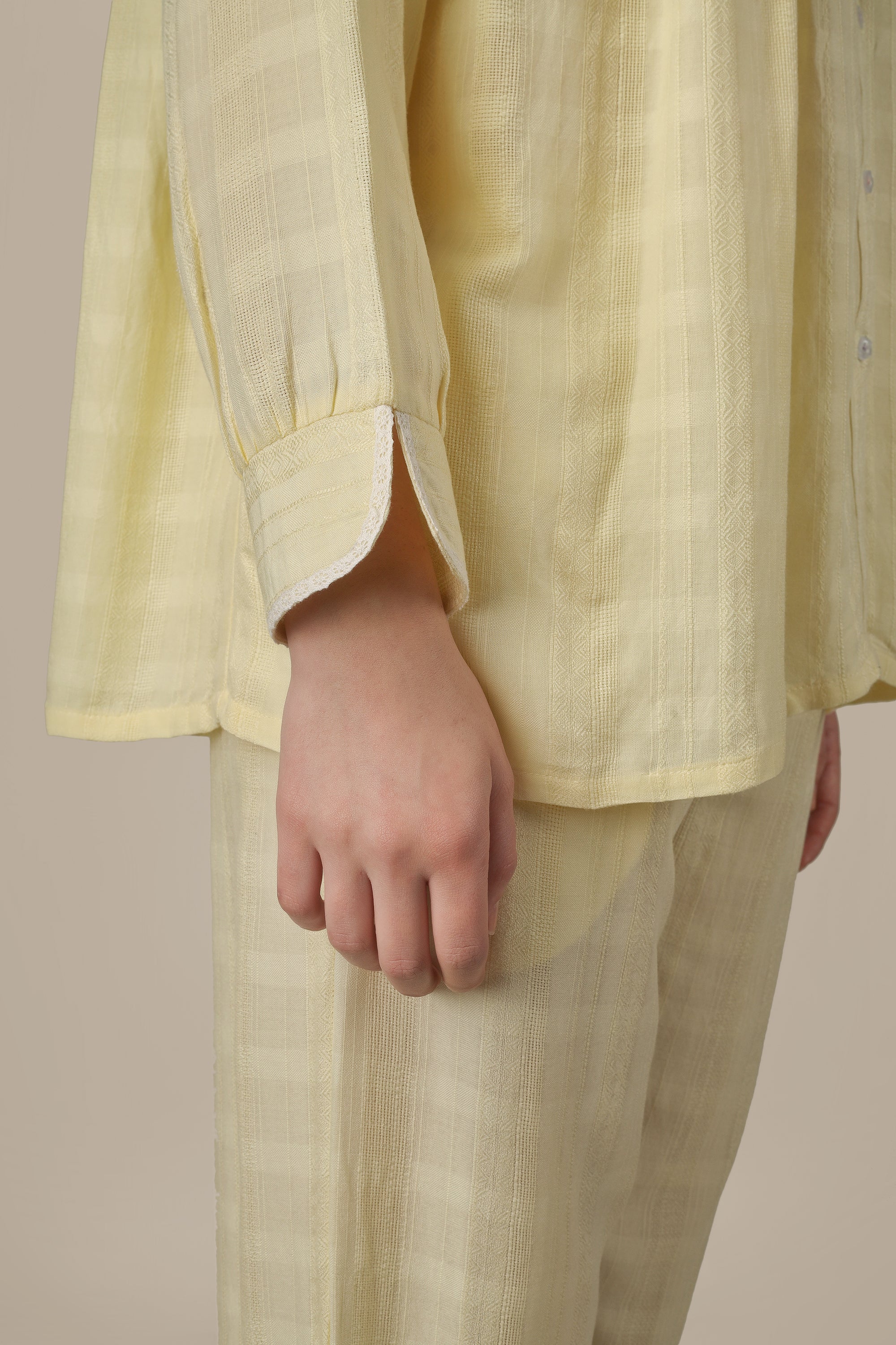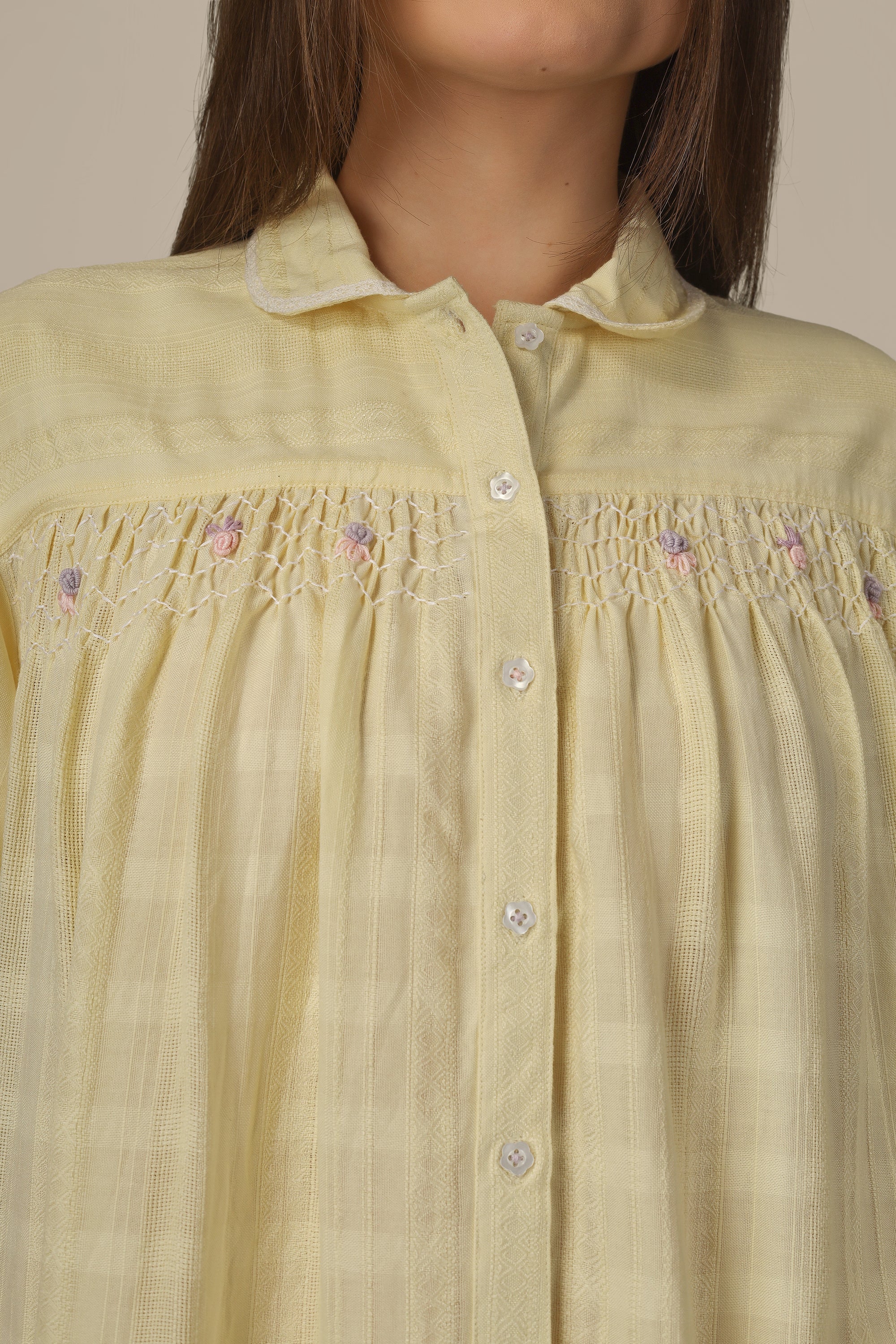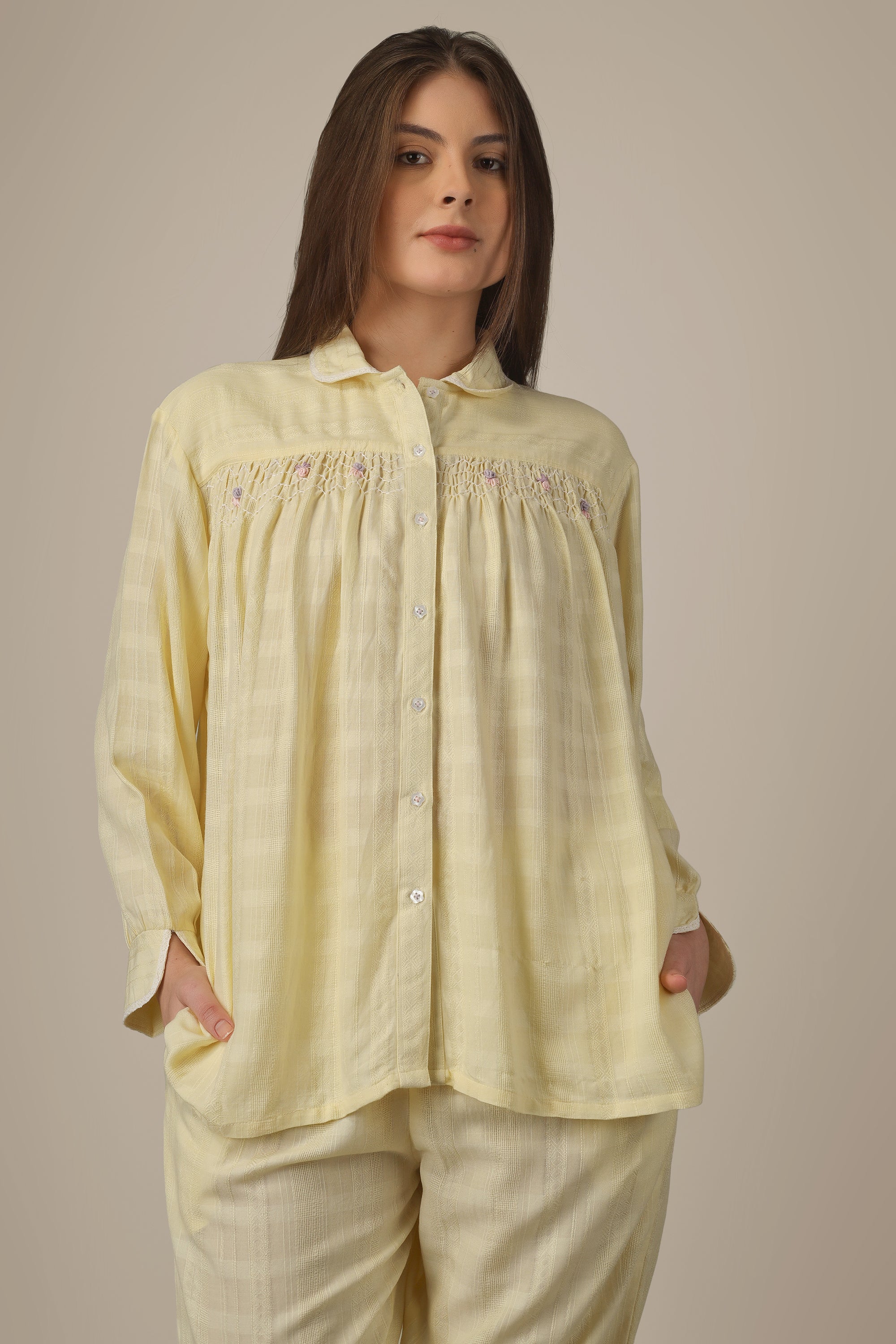 A premium blended jacquard cotton nightsuit designed for soft, breathable comfort.Features a hand-smocked, hand-embroidered top with a button-down front and matching Straight-fit pants.Effortless, elegant, and perfect for lounging or sleeping.