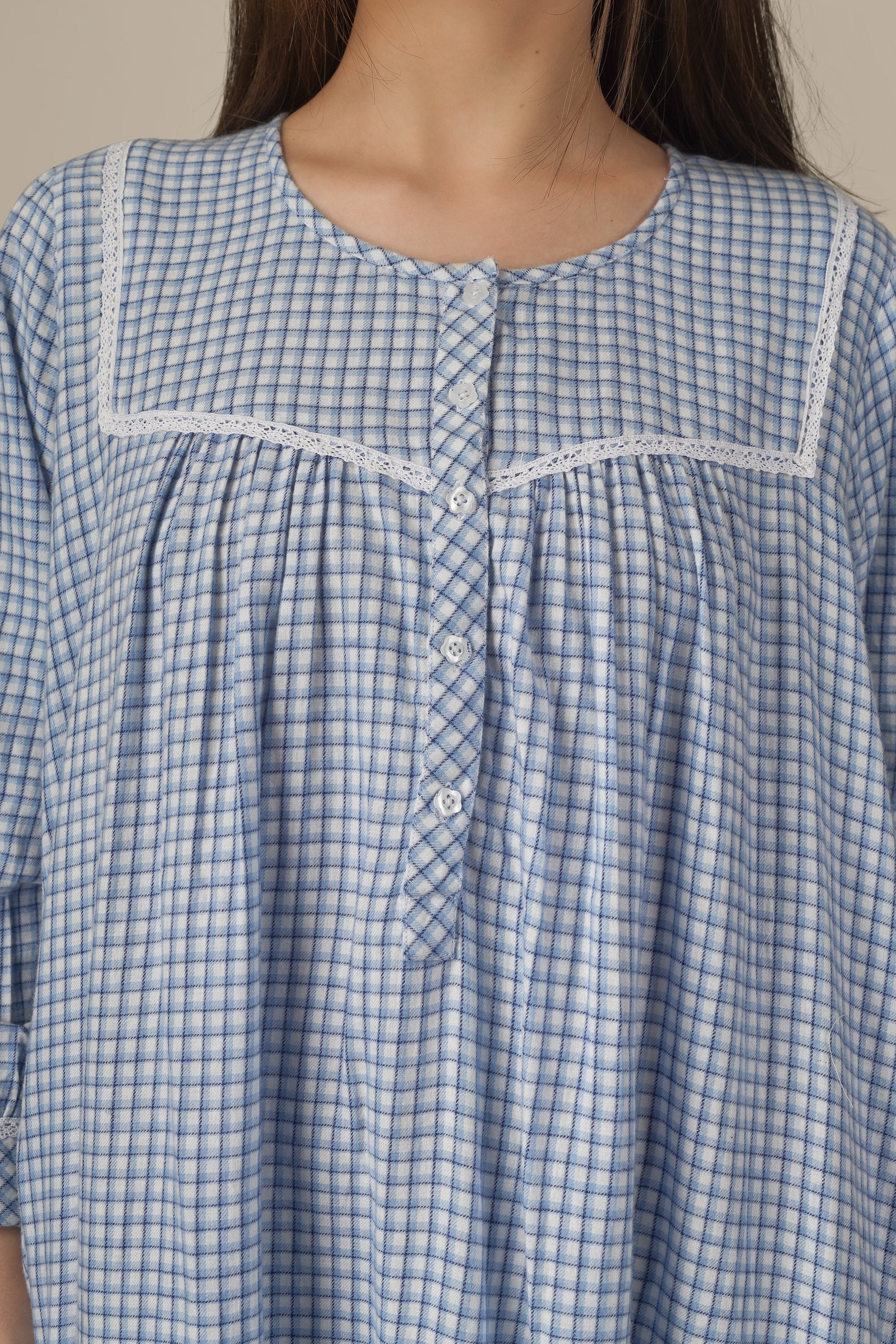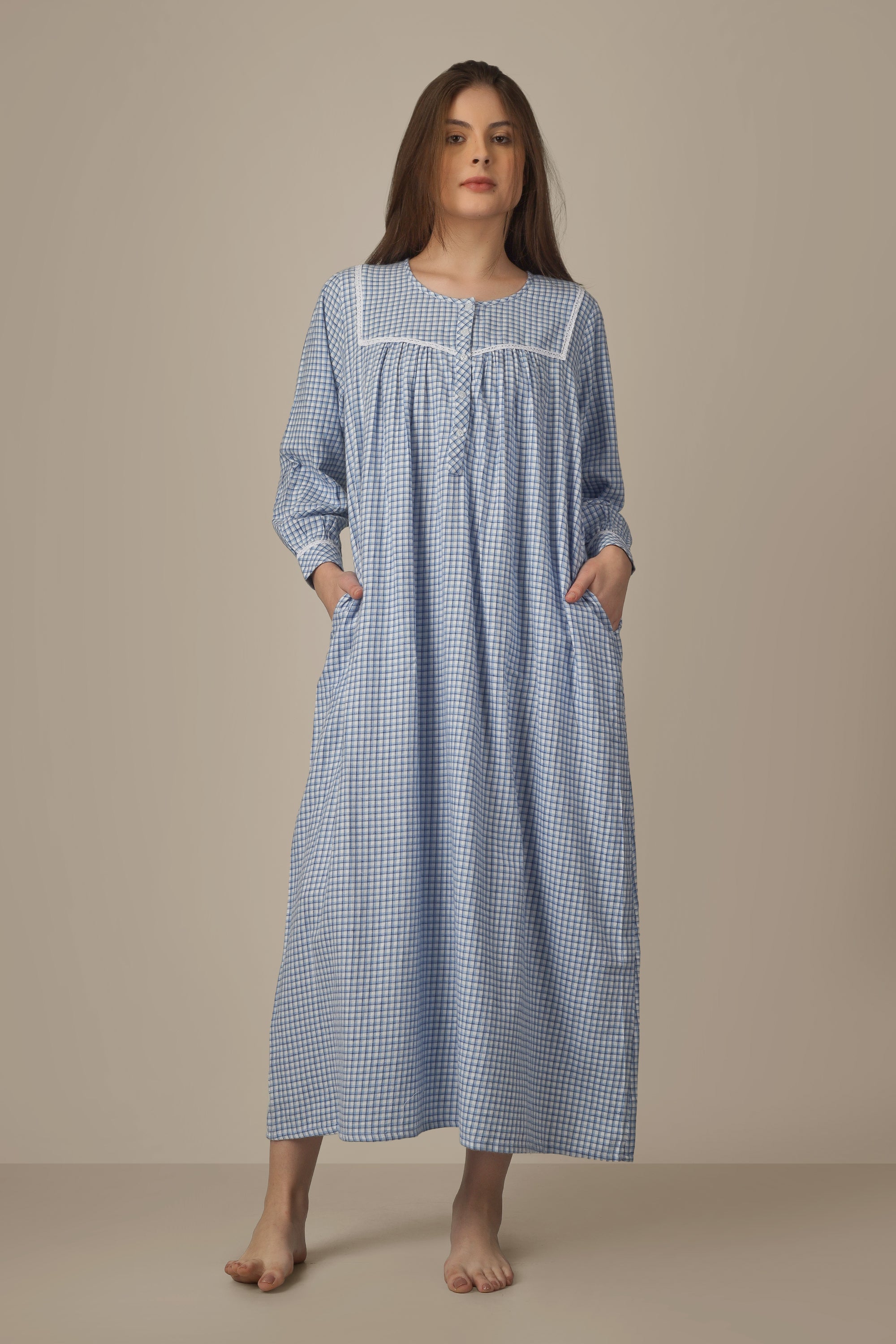 The Rene Nightdress is made from ultra-soft brushed cotton in a soothing blue-and-white check. Its lace-trimmed yoke, gentle gathers, and full sleeves offer a relaxed, airy fit with all-day comfort. Breathable, cosy, and beautifully detailed, it's perfect for lounging, sleeping, and slow, easy mornings.