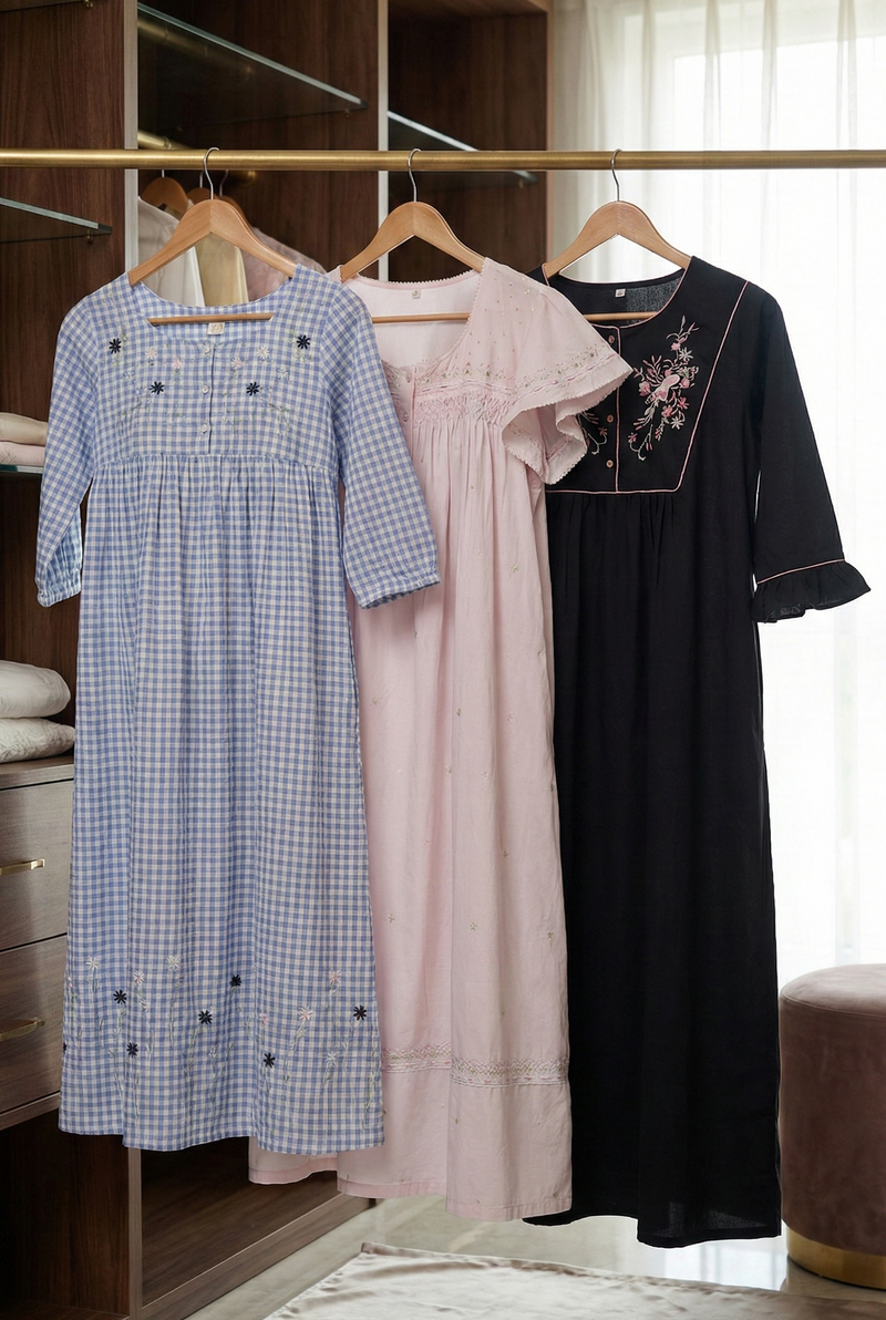 Our versatile collection with laid-back silhouettes is what dreams are made of and can be worn with ease. Whatever your age or stage of life might be, our collection is sure to fill your desire to look your best round the clock with dreamiest robes, romantic nightwear, pyjama sets, shorts, nightdresses and nightdresses with gowns. Blurring the line between nightwear and day wear, our nightdresses are an embodiment of fine craftsmanship; timeless designs and favor global slow fashion movement. Be it a special slumber party that you wish to throw or wedding sleepwear that you are so confused about, we are here to cater to your needs of finding your best luxury nightdress.
