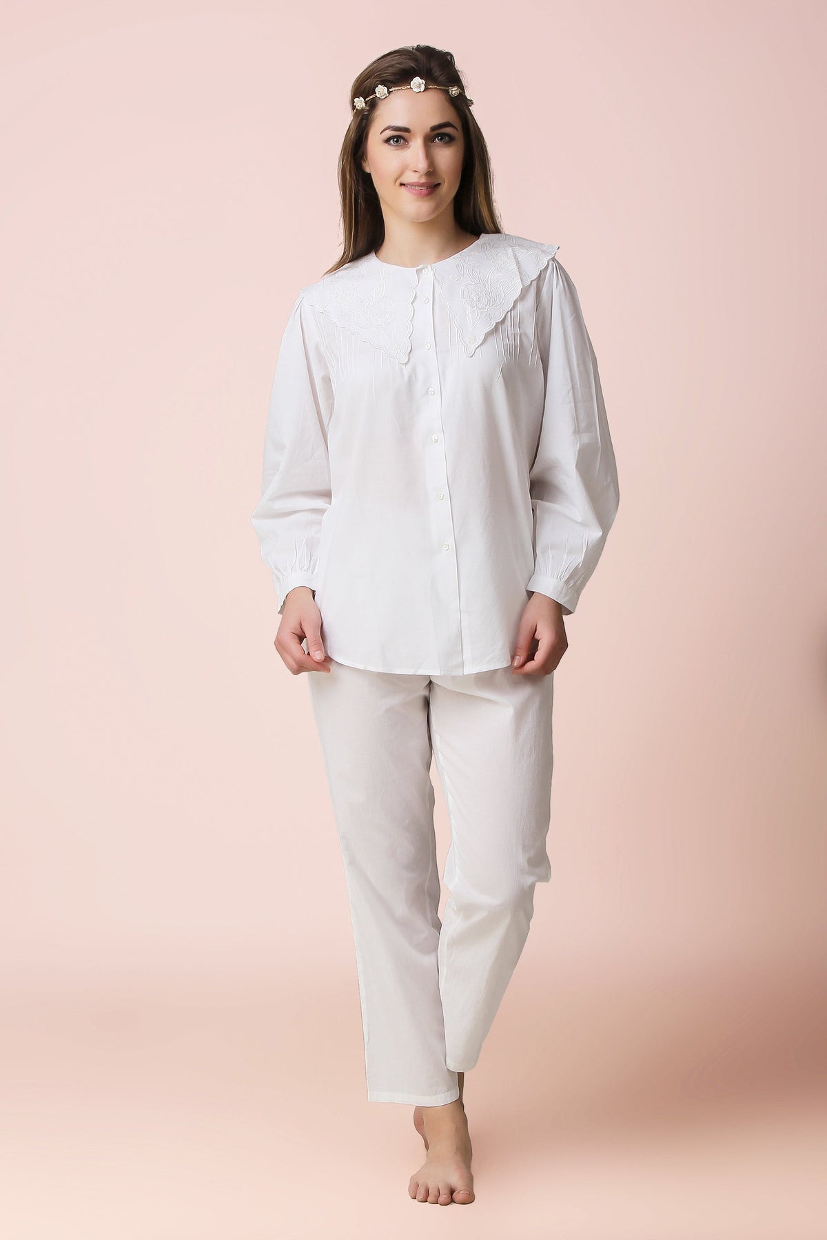 Elizabeth, is a traditional pyjama set for my lady.The starchy white pure cotton makes it proper with floral dori-embroidery on the Victorian collars. Now also available in plaid. Made in India, with lots of love.